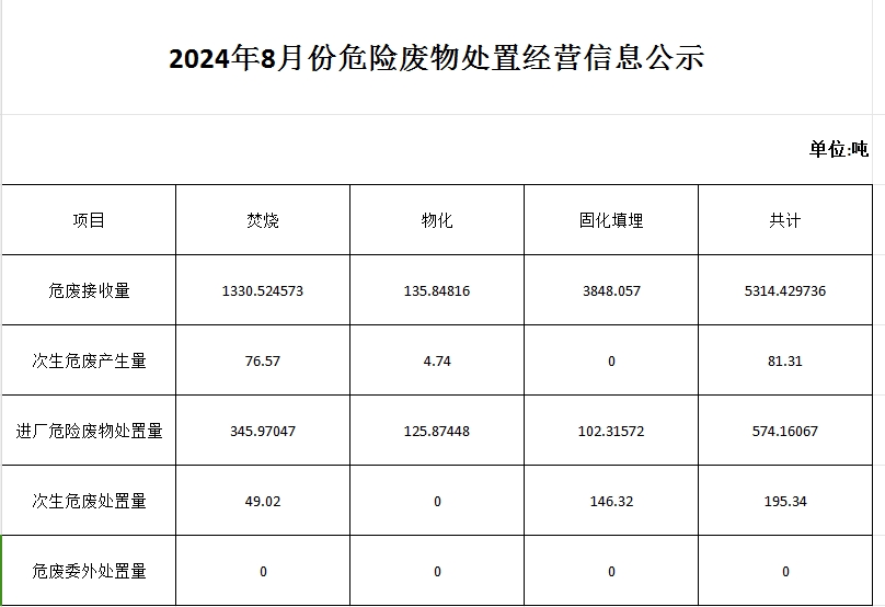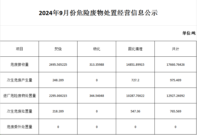 2024年9月份危險廢物處置經(jīng)營信息公示